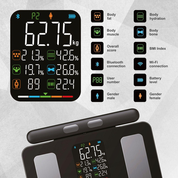 Szeroka gama parametrów do pomiaru obejmuje m.in.: masę ciała, BMI, procentową zawartość tkanki tłuszczowej, nawodnienie organizmu, masę mięśniową, masę kostną, poziom białka, tłuszcz trzewny, tłuszcz podskórny, beztłuszczową masę ciała, wiek metaboliczny, BMR/AMR oraz somatotyp.