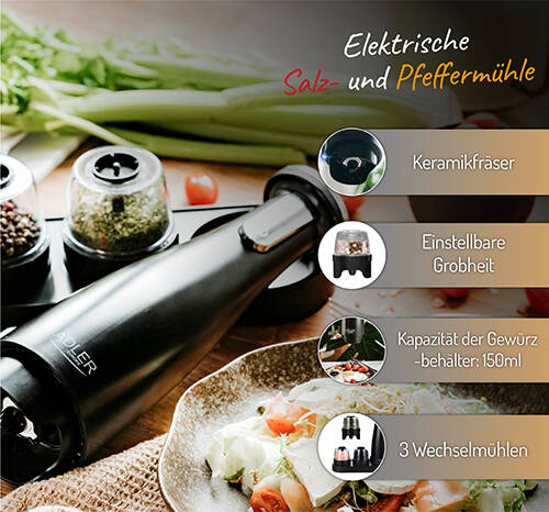 - Zestaw młynków do przypraw 3 w 1 został zaprojektowany z myślą o Twojej wygodzie, wyróżnia się połączeniem trzech młynków w zestawie. Elektryczny młynek AD 4449 jest wyjątkowo wygodny i prosty w obsłudze. Ma też kilka ciekawych funkcji. Na przykład możesz