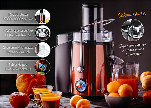 - Silnik o wysokiej mocy oferuje błyskawiczne wyciskanie soku