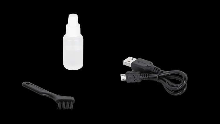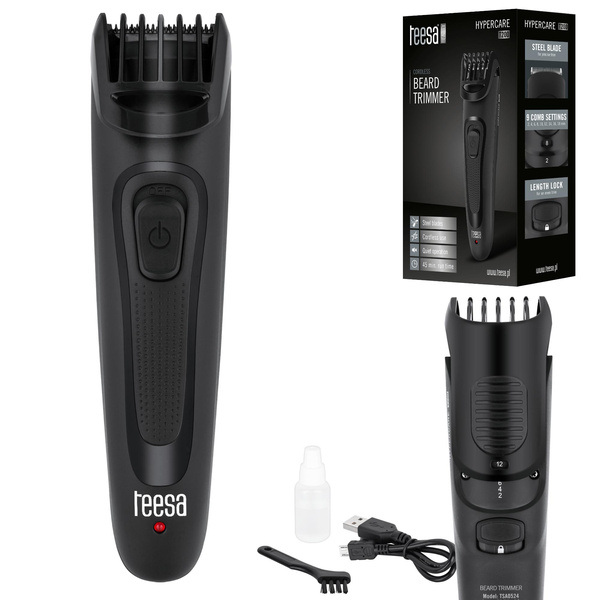 W zestawie: kabel USB, nasadka grzebieniowa, szczotka do czyszczenia, olejek do konserwacji, instrukcja obsługi