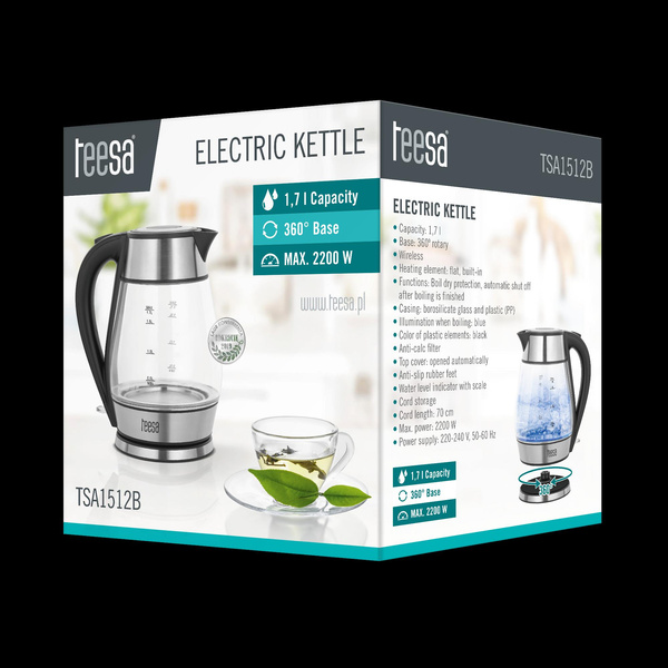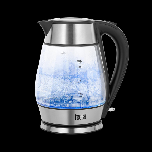 Czajnik elektryczny TEESA, szklany + inox, 2000 W, czarny, 1,7 L