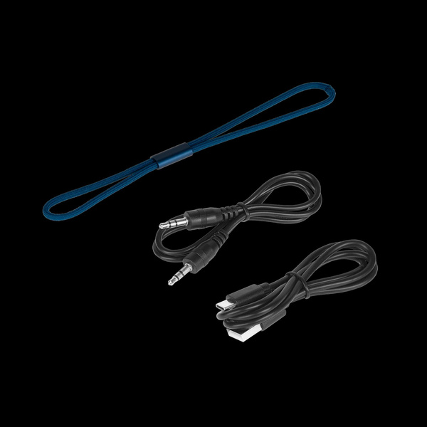 W zestawie: Kabel USB-C (54 cm), kabel AUX 3,5 mm (53 cm), smycz, instrukcja obsługi