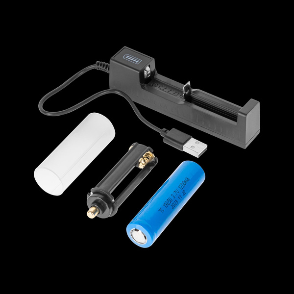 W zestawie: ładowarka USB, bateria 18650, adapter do baterii 18650