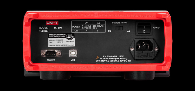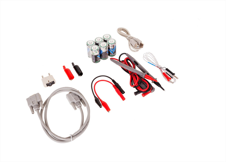 Akcesoria: Przewody pomiarowe, sonda pomiaru temperatury, krokodylki, krótkie przewody pomiarowe z krokodylkami, gniazdo do pomiaru kondensatorów, przewód USB, przewód RS232C, przewód sieciowy