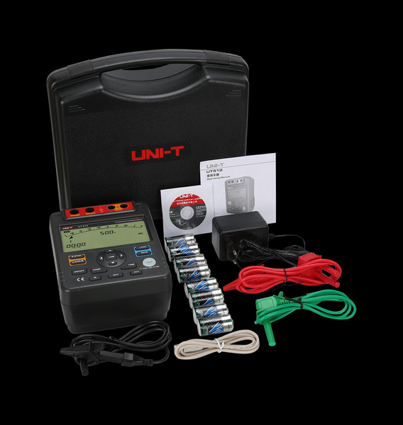 W zestawie: specjalne przewody pomiarowe z krokodylkami, przewód USB, zasilacz zewnętrzny, baterie, etui