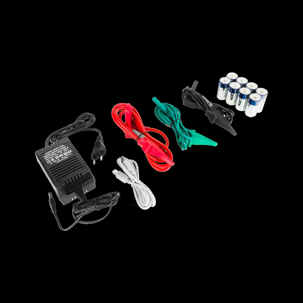W zestawie: specjalne przewody pomiarowe z krokodylkami, przewód USB, zasilacz zewnętrzny, baterie, etui