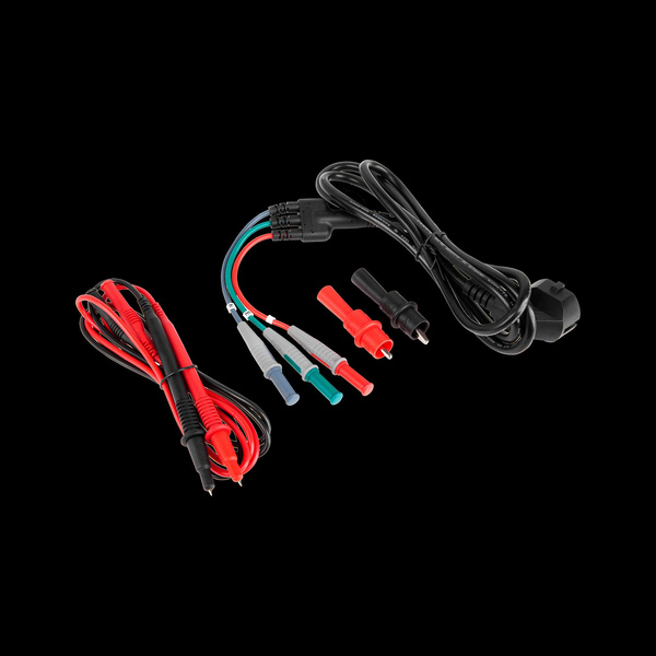 W zestawie: baterie, przewody pomiarowe, specjalny przewód pomiarowy, krokodylki pomiarowe, etui, pasek
