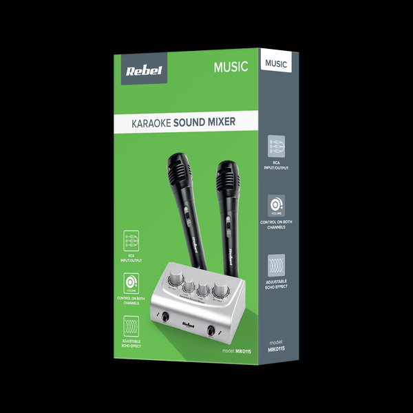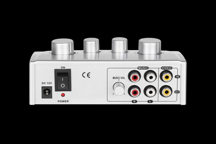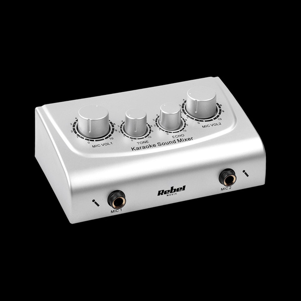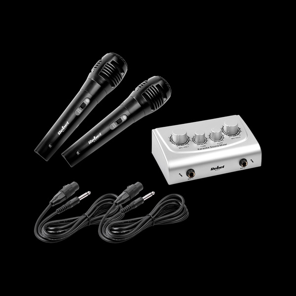 W zestawie: urządzenie, zasilacz, 2 mikrofony, 2 przewody XLR - jack 6,3 mm