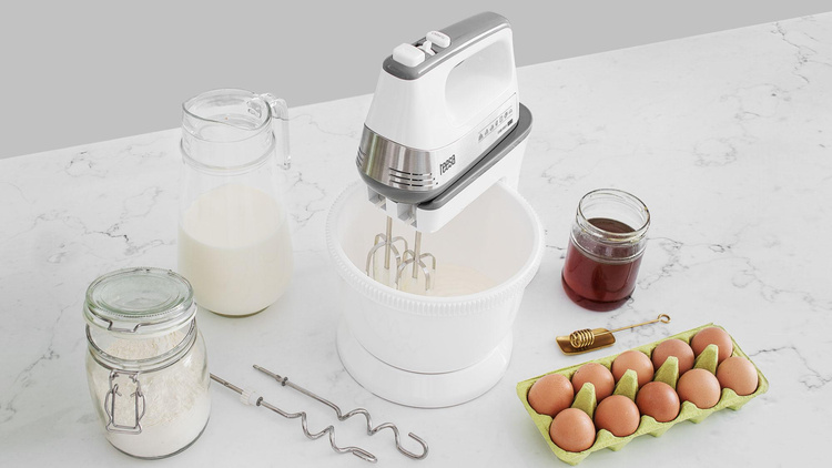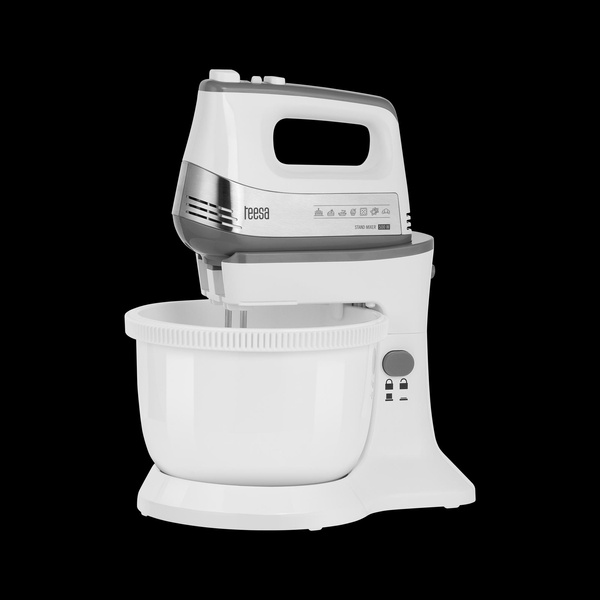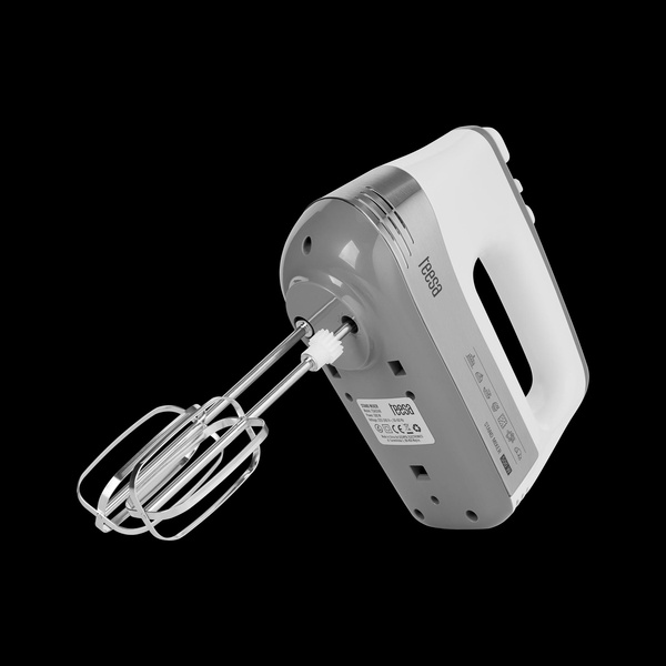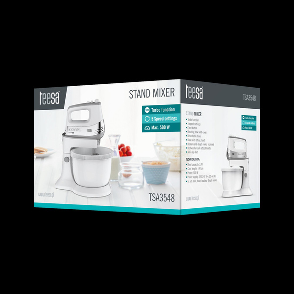 W zestawie: misa, podstawa, trzepaczki, mieszadła, instrukcja obsługi