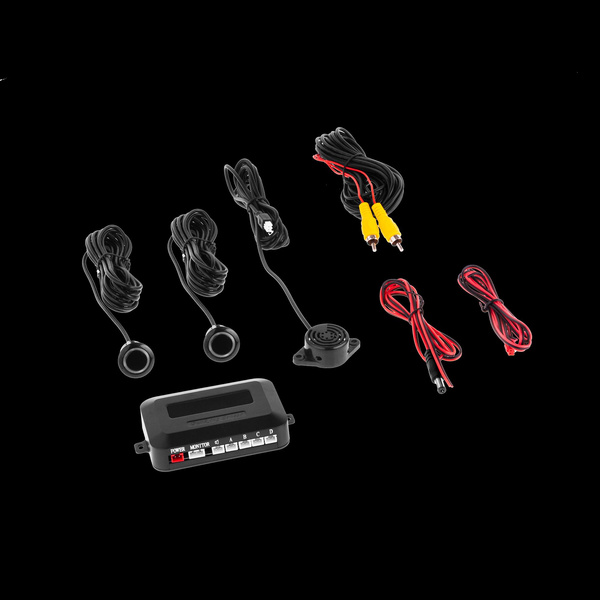 W zestawie: kamera w ramce tablicy rejestracyjnej z dwoma czujnikami, jednostka sterująca, 2x kabel AV, 2x przewód zasilania, buzzer, instrukcja obsługi