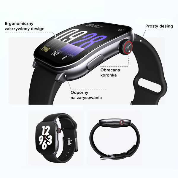 Funkcje: Monitor snu, krokomierz, licznik spalonych kalorii, pomiar natlenienia krwi, zarządzanie połączeniami, zarządzanie muzyką, powiadomienia z telefonu, budzik, alert bezczynności, stoper, minutnik, pogoda