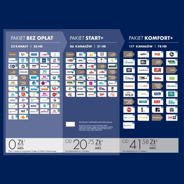 Inne: Obraz w rozdzielczości (HDTV) 720p; 1080i Skalowanie sygnału SDTV (PAL) do rozdzielczości HDTV (720p; 1080i); Kanały FTA; Pakiet Canal+ zapłacony na jeden miesiąc