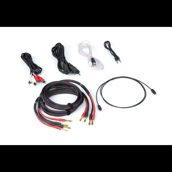 W zestawie: kabel zasilający, kabel optyczny, kabel RCA, kabel głośnikowy, antena radiowa, pilot