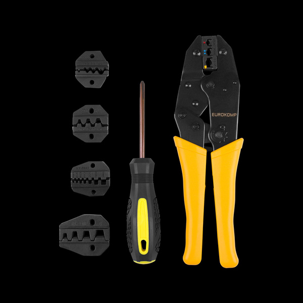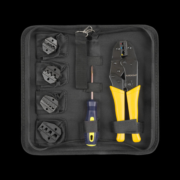 Ten poręczny zestaw nadaje się jako narzędzie do zaciskania końcówek kabli, konektorów i połączeń końcowych. 5 różnych szczęk zaciskowych dzięki zawartemu w zestawie śrubokrętowi można w krótkim czasie wymienić. Zestaw zabezpieczony jest w praktycznej torbie na narzędzia.