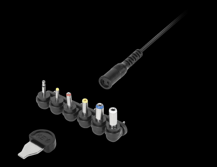 6 uniwersalnych wtyczek DC: 3,5x1,35 / 5,5x2,1 / 5,5x2,5 / 2,35x0,7 / 4,0x1,7 / 2,5 mono