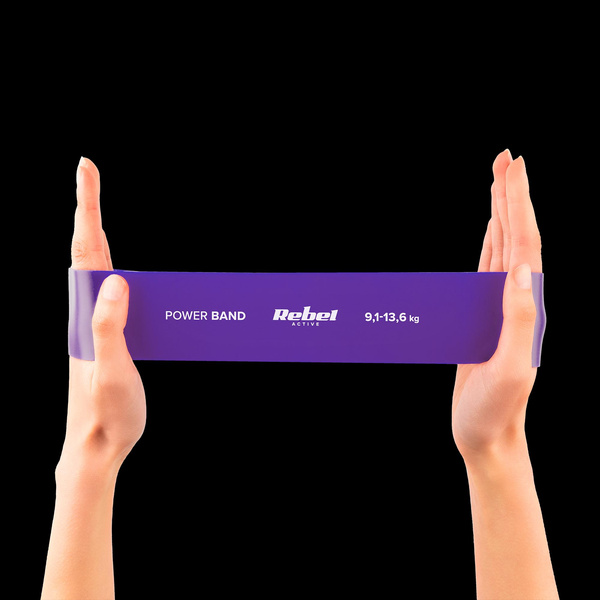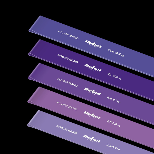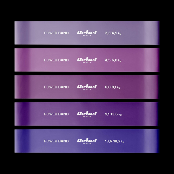 Zestaw gum do ćwiczeń lateksowy - Mini Band L, 2.3-18.2 kg, 5 gum, fioletowy, REBEL ACTIVE