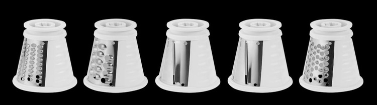 Rodzaje tarek: 4 tarki do krojenia: w cienkie plasterki, w cienkie słupki, w plasterki, w słupki, 1 tarka do przecierania