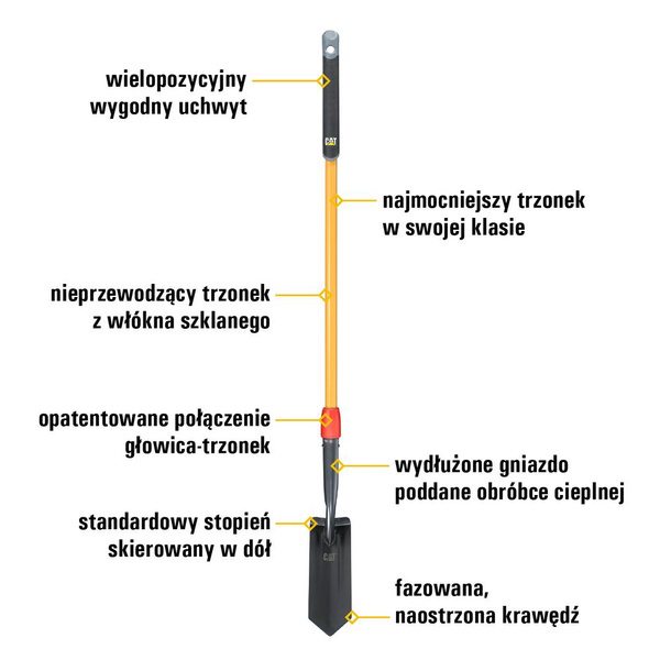 - Szpadel szkółkarski CAT K-Series 4" Trench, z oburęcznym uchwytem i trzonkiem z włókna szklanego, łączy trwałość i bezpieczeństwo z kutą, termicznie obrabianą głowicą i skośnym, zaostrzonym ostrzem, idealny do efektywnego wykonywania rowów.