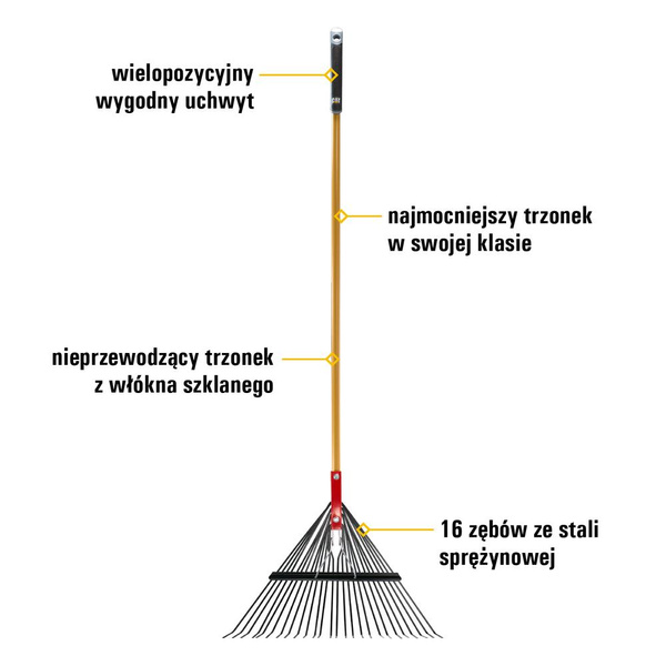 Zastosowanie wysokiej jakości włókna szklanego w trzonku grabi CAT gwarantuje ich niezrównaną wytrzymałość. Odporność na prąd i niemal niezniszczalna konstrukcja to cechy, które wyróżniają te grabie wśród narzędzi ogrodowych. Zostały stworzone do użytku w trudnych warunkach, zapewniając bezawaryjne działanie przez lata.