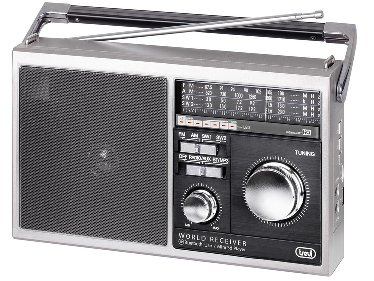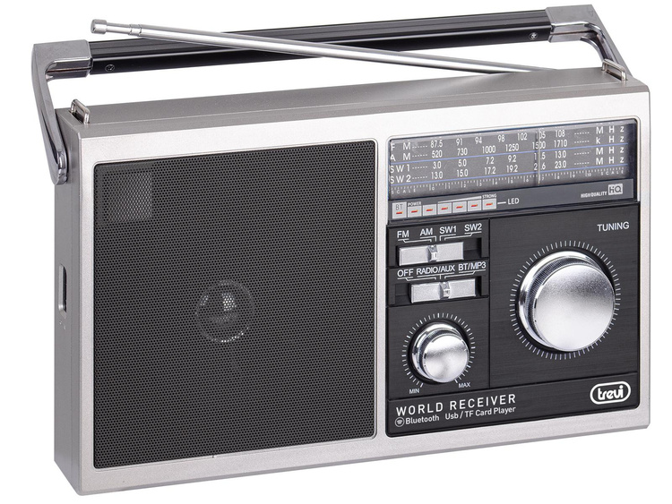 - 4-zakresowe radio przenośne Zakresy fal: FM / AM / SW1 / SW2 Odbiornik o wysokiej czułośc i Połączenie bezprzewodowe Odtwarzacz MP3 z USB i Micro SD Wejście AUX Gniazdo słuchawkowe Regulowana antena teleskopowa Zasilanie: 230V~50Hz Baterie: 4xD (UM1 nie w