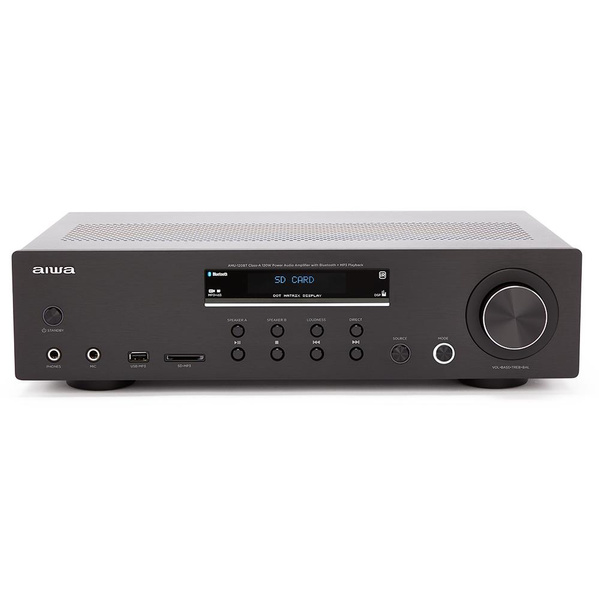 - AIWA AMU-120BT - Wzmacniacz stereo o mocy 120W RMS z Bluetooth 5.0, wejściami Phono MM, CD, AUX, USB i SD, regulacją tonów oraz trybami LOUDNESS i DIRECT zapewnia dynamiczne, czyste brzmienie i pełną kontrolę nad dźwiękiem.