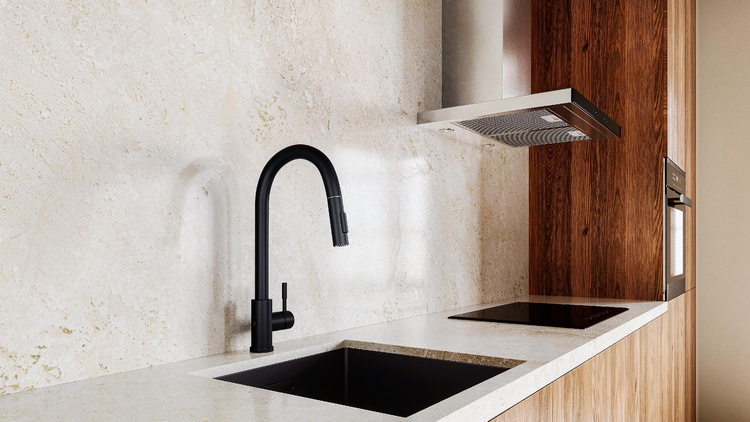 - Wyciągana wylewka zapewnia swobodę ruchu i zwiększa zasięg działania baterii, co znacząco ułatwia codzienne obowiązki w kuchni.