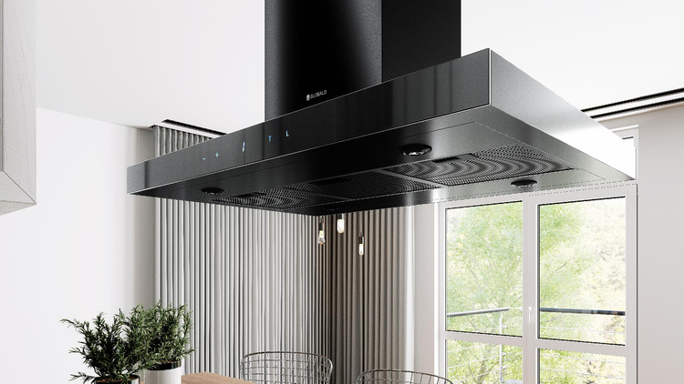 Ten klasyczny design okapu kuchennego Verta Isola 90.3 H2H Black sprawdzi się w jasnych, przestronnych wnętrzach – nad kuchenną wyspą.