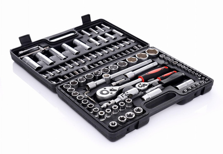 Bardzo rozbudowany zestaw narzędzi, w skład którego wchodzą klucze nasadowe i końcówki do wkrętaków (bity). Solidne wykonanie, wytrzymałe materiały oraz bardzo poręczne walizka, w której każde narzędzie ma swoje miejsce. Dla zapewnienia jeszcze większej wygody pracy, zestaw zawiera grzechotkę z 72 zębami.Duże możliwości narzędzi zachęcają, aby komplet wykorzystywać nie tylko w zastosowaniu domowym, ale i warsztatowym.Caly zestaw składa się z 108 różnych elementów, które mogą być łączone w wielu konfiguracjach.Daje to jeszcze większe możliwości użytkowania, w domu, podróży i pracy. Niezbędny we wszelkich profesionalnych w warsztatach samochodowych, remontowych oraz w firmachprodukcyjnych.Wykonane ze stali chromowo-wanadowej (CrV) - specjalna odmiana stali, używana do produkcji narzędzi.W przypadku tej odmiany stali jej hartowność zostaje zwiększona poprzez zastosowanie chromu i wanadu jako dodatków stopowych.Chrom gwarantuje odporność stali na korozję, utlenianie, ścieranie i dużą wytrzymałość w wysokiej temperaturze.Dodatek wanadu hamuje wzrost ziaren podczas obróbki termicznej, zwiększając jednocześnie ciągliwość zarówno postaci hartowanej, jak i odpuszczonej. - nasadki 1/2": 10,11,12,13,14,15,16,17,18,19,20,21,22,23,24,27,30,32mm.- nasadki długie 1/2": 14,15,17,19mm. - nasadki do świec 1/2": 16,21mm- nasadki 1/4":4,4.5,5,5.5,6,7,8,9,10,11,12,13,14mm. - nasadki długie 1/4":6,7,8,9,10,11,12,13mm.- nasadki 1/4"z bitami: Torx(T8,10,15,20,25,30), Imbus(3,4,5,6mm), PZ (1,2), PH(1,2), Płaskie(4,5.5,7mm).- bity: Imbus (6,8,10,12,14mm), PH(3,4), Płaskie(8,10,12mm), PZ(3,4), Tox(T40,45,50,55).- wkrętak 1/2" do nasadek i bitów. -adapter do bitów 1/2". - grzechotki 1/2"i 1/4".- przedłużki 1/2" (125,250mm) oraz 1/4"(50,100mm). - przelotka1/2".- pokrętło typ T z kwadratem zabierającym 1/4". - przeguby Cardana 1/2"i 1/4". - imbusy typ L(1.5,2,3mm). - klucze nasadowe torx na 1/4 i 1/2 WALIZKA Potrzebujesz pomocy? Masz pytania?Zadaj pytanie a my odpowiemy niezwłocznie, najciekawsze pytania i odpowiedzi publikując dla innych.