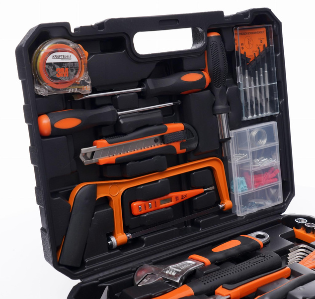Zestaw narzędziowy 100 elementów Model : KD10839 ZESTAW NARZĘDZI W WALIZCE100 ELEMENTÓW! KD10839 Niezwykle rozbudowany zestaw narzędzi marki Kraft&Dele o symbolu KD10839. Narzędzia cechuje solidne wykonanie, wytrzymałe materiały oraz poręczna walizka, w której każde narzędzie ma swoje miejsce. Cały zestaw składa się z 100 różnych elementów, które zapewnią odpowiedni dobór narzędzia do potrzeb. Narzędzia wykonane są z utwardzanej stali chromowo-wanadowej (CrV) przeznaczonej dla narzędzi warsztatowych. Chrom gwarantuje odporność stali na korozję, utlenianie, ścieranie i dużą wytrzymałość na wysokie temperatury. Dodatek wanadu hamuje wzrost ziaren podczas obróbki, zwiększając jednocześnie ciągliwość zarówno postaci hartowanej, jak i odpuszczonej. Walizka wykonana z trwałych tworzyw sztucznych pozwala na utrzymanie porządku i łatwe przenoszenie narzędzi. Każde narzędzie posiada swoje wyznaczone miejsce, w których łatwo znaleźć potrzebny rozmiar klucza. Skład zestawu: Komplet 100 części !!! 1/4 nasadki: 5, 6, 7, 8, 9, 10, 11, 12, 13 mmuchwyt z grzechotką ¼młotek 350 gr.kombinerki 6”szczypce boczne 6”nożówka z brzeszczotem (piła do metalu)próbnik napięcia - śrubokrętklucz nastawny 8”miara zwijana 3 mzestaw bitów w uchwycie (10 szt.)śrubokręty: SL6x100 mm, PH2X100 mmwkrętaki precyzyjne: PH 0-1, SL 1.4-2.0-2.4-3.0 mmszczypce hydrauliczne 8"nóż do tapetostrza do noża (5 szt.)taśma izolacyjnaklucze imbusowe: 1,5; 2; 2,5; 3; 4; 5; 5,5; 6 mmzestaw elementów łączeń (kołki, wkręty itp.) Walizka transportowa! Potrzebujesz pomocy? Masz pytania?Zadaj pytanie a my odpowiemy niezwłocznie, najciekawsze pytania i odpowiedzi publikując dla innych.