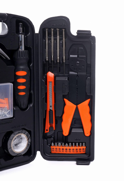 Niezwykle rozbudowany zestaw narzędzi marki Kraft&Dele o symbolu KD10465. Narzędzia cechuje solidne wykonanie, wytrzymałe materiały oraz poręczna walizka, w której każde narzędzie ma swoje miejsce. Cały zestaw składa się z 129 różnych elementów, które zapewnią odpowiedni dobór narzędzia do potrzeb. Narzędzia wykonane są z utwardzanej stali chromowo-wanadowej (CrV) przeznaczonej dla narzędzi warsztatowych. Chrom gwarantuje odporność stali na korozję, utlenianie, ścieranie i dużą wytrzymałość na wysokie temperatury. Dodatek wanadu hamuje wzrost ziaren podczas obróbki, zwiększając jednocześnie ciągliwość zarówno postaci hartowanej, jak i odpuszczonej. Walizka wykonana z trwałych tworzyw sztucznych pozwala na utrzymanie porządku i łatwe przenoszenie narzędzi. Każde narzędzie posiada swoje wyznaczone miejsce, w których łatwo znaleźć potrzebny rozmiar klucza. Skład zestawu: 1 x długie szczypce 165mm1 x klucz 150mm1 x szczypce ukośne 165mm1 x młotki pazurowe 8 uncji1 x topedo poziom 9"8 x klucz sześciokątny SAE8 x klucz imbusowy MM1 x nóż1 x stalowa taśma miernicza 3,5M4 x precyzyjny śrubokręt1 x zaciskarki 8"20 x bity wkrętakowe1 x uchwyt do wkrętaków z grzechotką80 x różne zapięcia Potrzebujesz pomocy? Masz pytania?Zadaj pytanie a my odpowiemy niezwłocznie, najciekawsze pytania i odpowiedzi publikując dla innych.