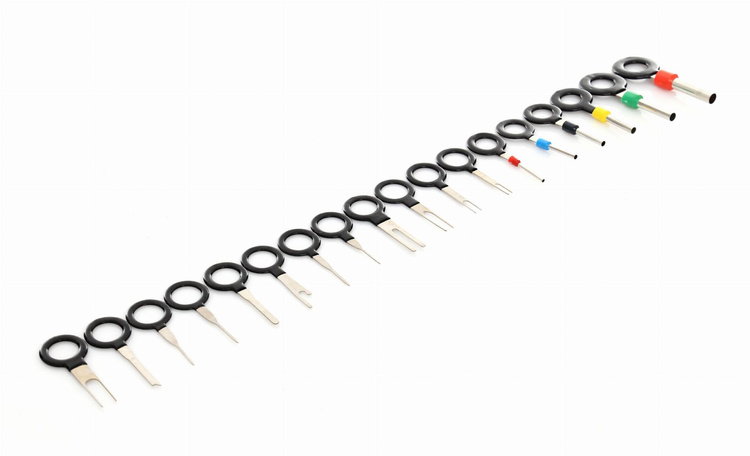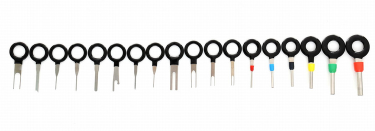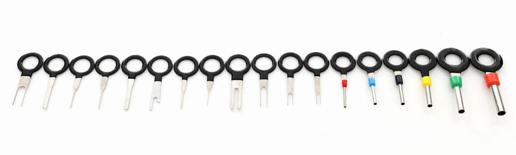 WYJMAKI DO PINÓW 18SZT KD1133 OPIS TOWARU Zestaw 18 kluczy do demontażu pinów, konektorów. Ich rączka pokryta jest gumą, która zwiększa komfort pracy. Taki zestaw jest niezbędnym sprzętem każdego elektryka/ elektronika. Jest niezwykle przydatny przy przeróbkach i naprawach instalacji elektrycznej w samochodzie, motocyklu, łodzi, a także w domu przy naprawach agd, rtv czy komputerów. Wyjmaki mają ergonomiczny kształt, dzięki czemu demontaż jest bardzo łatwy. Można pracować także na urwanym pinie lub zagiętej blaszce konektora. A co najważniejsze- wyjmaki nie uszkadzają pinów. Parametry bezpieczeństwa - Bezpieczeństwo rodzaj ostrzeżenia