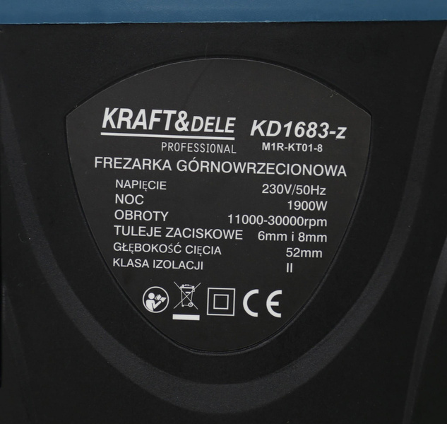 Frezarka górnowrzecionowa KD1683-Z marki Kraft&Dele. Urządzenie napędzane przez wydajny silnik elektryczny o mocy maksymalnej 1900W osiągający nawet 30.000 obrotów na sekundę! Nasze urządzenie jest niewiarygodnie funkcjonalne, dzięki zastosowaniu wielu przydatnych rozwiązań. Ogranicznik głębokości - wygodny w użyciu ogranicznik pozwala na precyzyjne ustawienie potrzebnej głębokości cięcia. Wylot pyłu - dla zapewnienia czystszego środowiska pracy należy zawsze podłączać urządzenie do odkurzacza podczas pracy. Blokada spustu - aby uruchomić frezarke, wystarczy nacisnąć spust umieszczony na rękojeści. Dodatkowy przycisk blokady pozwala na swobodne puszczenie spustu oraz ciągłą pracę urządzenia. Frezarka wyposażona jest w prowadnicę równoległą oraz szablonową PARAMETRY TECHNICZNE PRODUKTU Marka: KRAFT&DELE Model: KD1683-Z Typ: frezarka górnowrzecionowa Moc: 1900W Zasilanie: 230V / 50Hz Prędkość obrotowa bez obciążenia: 11.000 - 30.000 rpm Regulacja obrotów: 5-cio stopniowa Maksymalna głębokość cięcia: 52mm Waga: 4 kg Parametry bezpieczeństwa - Bezpieczeństwo rodzaj ostrzeżenia