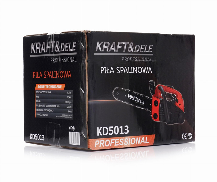 Piła marki KRAFT&DELE o mocy 1,2 KM należy do najbardziej dynamicznych o zwartej i mocnej konstrukcji. Sprawdza się niezawodnie nawet po latach użytkowania prac budowlanych w drewnie, prac w gospodarstwie i rolnictwie, w sadzie.Uniwersalna - doskonała do prac przydomowych i leśnych. Mocna, trwała i niezawodna pilarka, która spełni najwyższe wymagania.Piła różni się od innych modeli wyposażeniem w pompkę paliwa, oraz lżejszą i bardziej wytrzymałą konstrukcją.Cechuje się bardzo dobrą jakością wykonania oraz bardzo dobrymi podzespołami użytymi do jej budowy. Posiada system łatwego startu EASY START - wystarczy 1 pociągnięcie do odpalenia oraz system tłumienia drgań potrzebny przy pracy z grubym drewnem. Przeznaczona m.in. do:przygotowywania drewna opałowego,prac budowlanych w drewnie,prac w gospodarstwie i rolnictwie,w sadzie,ścinki drzew,pielęgnacji drzew, itp. Parametry: • ModelKD5013 • Pojemność skokowa silnika 58 cm3 • Moc maksymalna silnika 1,2KM • Prędkość przy maks. mocy 11000 obr./min • Pojemność zbiomika paliwa 230 cm3 • Pojemność zbiornika na na olej smarujący łańcuch 210 cm3 • Typ silnika Dwusuwowy • Maksymalna prędkość silnika na biegu jałowym 3000 +/- 500 obr./min • Zębatka 6TX 3/8" • Poziom mocy akustycznej Lwa 113dB(A) • Rodzaj paliwa Mieszanka • Podziałka łańcucha 3/8" • Szerokość rowka 1,3 mm • Waga ok. 4 kg Skład zestawu: • Piła łańcuchowa - spalinowa KRAFT&DELE KD5013 • Osłona prowadnicy • Zestaw kluczy (klucz do świec oraz prowadnicy, wkrętak, imbusy) • Zbiornik do mieszania oleju z benzyną • Pilnik • Łańcuch • Prowadnica o długości 30cm • Paragon lub FV. • Oryginalne opakowanie Parametry bezpieczeństwa - Bezpieczeństwo rodzaj ostrzeżenia