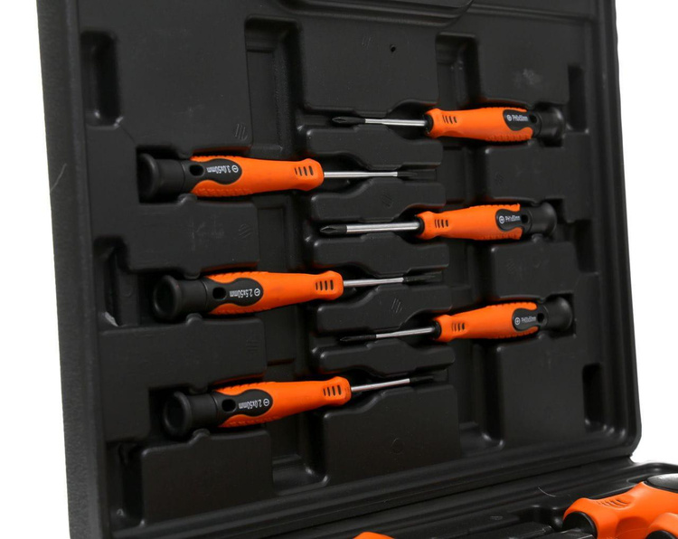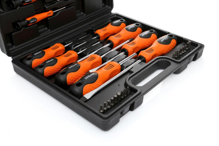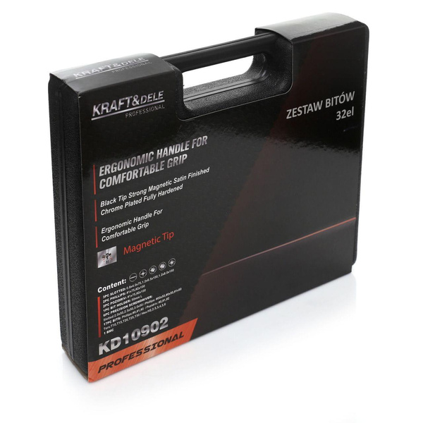 Zestaw śrubokrętów i bitów KD10902 marki Kraft&Dele sprawdzi się w każdym garażu czy warsztacie. Dołączona w zestawie walizka ułatwia przechowywanie śrubokrętów.Użycie wysokiej jakości materiałów podczas produkcji śrubokrętów i bitów przedłuża ich okres żywotności. Zestaw składa się z 32 elementów. SKŁAD ZESTAWU: Wkrętaki tradycyjne: - 3 płaskie (4.0x75, 6.5x100, 8.0x150mm) - 2 krzyżowe (PH1x75, PH2x100mm) - 2 typu gwiazdka (PZ1x75, PZ2x100mm) Wkrętaki precyzyjne: - 3 płaskie (2.0, 2.5, 3.0) - 3 krzyżowe (PH0, PH00, PH1) Bity + uchwyt: - 3 krzyżowe (PH0, PH1, PH2) - 5 TORX (T10, 15, 20, 25, 30) - 6 sześciokątnych (2, 2.5, 3, 4, 5, 6) - 3 typu gwiazdka (PZ0, PZ1, PZ2) Parametry bezpieczeństwa - Bezpieczeństwo rodzaj ostrzeżenia