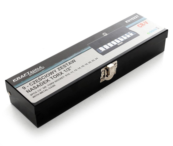 Kraft&Dele KD10227 to 9-częściowy zestaw nasadek Torx na 1/2", idealny do obsługi różnorodnych śrub Torx w profesjonalnych i domowych zastosowaniach. Wykonane z najwyższej jakości stali chromowo-vanadanowej, nasadki zapewniają trwałość i niezawodność w każdych warunkach pracy. Różnorodność rozmiarów od E10 do E24 czyni ten zestaw wszechstronnym narzędziem, które sprosta wielu różnym projektom naprawczym czy montażowym. Poręczna metalowa walizka ułatwia przechowywanie i transport nasadek, zapewniając jednocześnie ich ochronę przed uszkodzeniami. Długość nasadek wynosząca 37mm sprawia, że są one odpowiednie do obsługi różnych typów śrub Torx, zarówno w trudno dostępnych miejscach, jak i w bardziej standardowych warunkach. Kraft&Dele KD10227 to gwarancja wysokiej jakości wykonania, trwałości i skuteczności w każdej pracy, gdzie używane są śruby Torx. Nasadki Torx na 1/2" 9szt. o rozmiarach:- E10, E11, E12, E14, E16, E18, E20, E22, E24- poręczna metalowa walizka Parametry bezpieczeństwa - Bezpieczeństwo rodzaj ostrzeżenia
