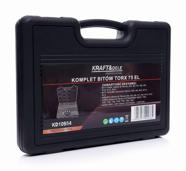 Komplet bitów TORX 75el. KD10954 to profesjonalny zestaw narzędzi, idealny do różnorodnych zastosowań naprawczych i konserwacyjnych. Wyposażony w 75 różnorodnych bitów, obejmuje on szeroki zakres rozmiarów i typów, co sprawia, że jest niezastąpiony w warsztacie lub garażu. ZESTAW ZAWIERA: BITY RIBE (30MM I 75MM): R5 / R6 / R7 / R8 / R9 / R10 / R12 / R14BITY SPLINE (30MM I 75MM): M5 / M6 / M8 / M10 / M12IMBUSY (30MM 75MM): H4 / H5 / H6 / H7 / H8 / H12TORX (30MM I 75MM Z OTWOREM I BEZ): T20 / T25 / T30 / T40 / T45 / T50 / T55 / T60 ADAPTERY:3/8"x 10 mm1/2"x 10 mm X 2 - poręczna walizka Parametry bezpieczeństwa - Bezpieczeństwo rodzaj ostrzeżenia