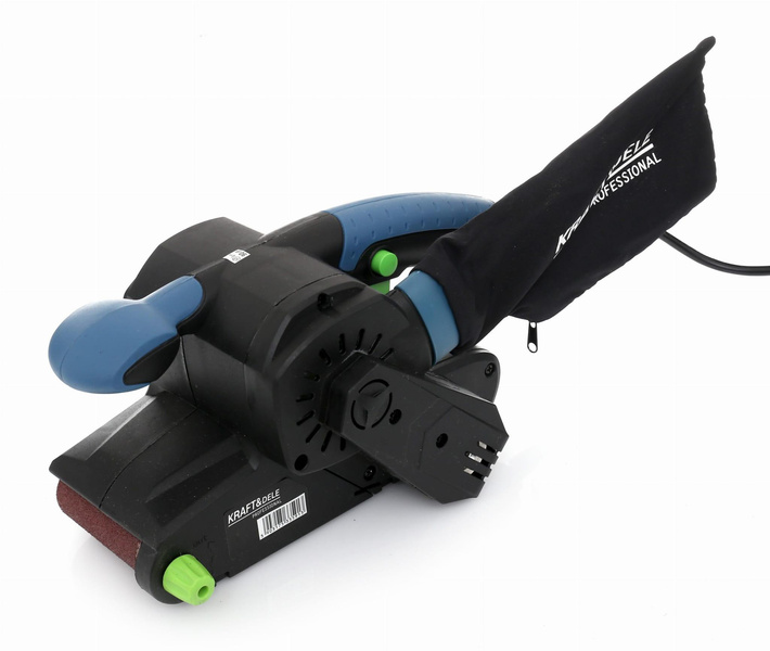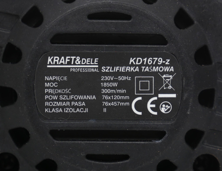 SZLIFIERKA TAŚMOWA 1850W KD1679-Z Przedmiotem aukcji jest szlifierka taśmowa marki Kraft&Dele przeznaczona jest do szlifowania i polerowania dużych płaskich powierzchni z różnego rodzaju materiałów np. do wstępnego szlifowania drzwi i płyty przed ponownym malowaniem. Kształt oraz wyważony środek ciężkości urządzenia KD1679 pozwala na długotrwałą pracę z urządzeniem bez zmęczenia. Ergonomiczna budowa Szlifierka taśmowa jest bardzo poręczna – niezwykle kompaktowa i ergonomiczna budowa, umożliwia szlifowania dużych powierzchni. Ergonomiczna rękojeść pokryta powłoką antypoślizgową dla większego komfortu pracy. Dodatkowy ogumowany uchwyt znacząco ułatwia pracę z urządzeniem zapewniając stabilność podczas szlifowania. Blokada pracy ciągłej Bezpieczny, wielofunkcyjny włącznik zapobiega przypadkowemu włączeniu. Szlifierka posiada przycisk blokady do pracy ciągłej pozwalający na wygodną obsługę również dla osób leworęcznych. System odprowadzania pyłu System odprowadzania pyłu z możliwością bezpośredniego podłączenia worka na pył zapewnia porządek w miejscu pracy. W celu lepszego odprowadzania pyłu w urządzeniu stosuje się papiery ścierne z otworami, jest to znacznie lepsze rozwiązanie niż odprowadzanie wyłącznie krawędziowe. DANE TECHNICZNE: Napięcie 230V Moc 1850W Prędkość obrotowa bez obciążenia 300m/min Powierzchnia szlifowania 76x120mm Wymiary taśmy szlifującej 76x457mm Waga 3kg Parametry bezpieczeństwa - Bezpieczeństwo rodzaj ostrzeżenia