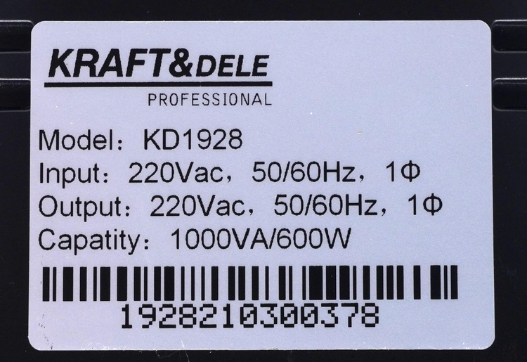 Zasilacze awaryjne UPS z wyświetlaczem LCD marki Kraft&Dele cechują się dużą niezawodnością i wytrzymałością. Zasilacze UPS (ang. uninterruptible power supply – zasilacz bezprzerwowy) – urządzenie lub system, którego funkcją jest utrzymanie zasilania innych urządzeń elektrycznych lub elektronicznych w przypadku zaniku lub nieprawidłowych parametrów zasilania sieciowego. Urządzenia tego typu stosowane są najczęściej do zasilania komputerów, a zwłaszcza serwerów. Dzięki ich zastosowaniu, w przypadku awarii zasilania zmniejsza się ryzyko utraty danych znajdujących się aktualnie w pamięci operacyjnej komputera, a nawet uszkodzenia urządzeń pamięci masowej. Zasilacze awaryjne UPS znajdą zastosowanie w ochronie takich urządzeń jak:komputeryserwerysystemy alarmowekasy fiskalnesprzęt RTVurządzenia medyczne MODEL: KD1928Pojemność: 1000VAMoc: 600WNapięcie wejściowe: 140 - 300VACNapięcie wyjściowe: 220V±10%(tryb baterii)Czas transferu: Typowy 4 - 8msCzęstotliwość: Symulowana fala sinusoidalnaIlość i rodzaj baterii:. 9AHx1Czas ładowania: 4 - 6 godzin do 90% pojemnościRozmiar(mm): 280x90x140mmWaga(KG): 4,6kgWilgotność: 0-90% RH @ 0 - 40°C non - condensingHałas: Mniej niż40dB Parametry bezpieczeństwa - Bezpieczeństwo rodzaj ostrzeżenia