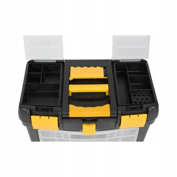 WARSZTATOWY WÓZEK NARZĘDZIOWY Z ORGANIZEREM KD1075 OPIS I CECHY TOWARU Mobilny, poręczny wózek warsztatowy z organizerem marki Kraft&Dele model KD1075 to niezastąpiony przedmiot podczas transportu narzędzi. Dużą zaletą Naszego wózka jest to że z łatwością zabierzemy go w każde miejsce. Wykonany z wysokiej jakości materiałów. Ergonomiczny uchwyt, aby dopasować się do Twojego największego komfortu. Wyprofilowana rękojeść, aby zapewnić ci komfort i wygodę. Wyposażony w koła które zapewniają stabilną jazdę oraz wysoką przyczepność do różnych powierzchni. Platforma została wzmocniona dodatkowymi podporami, które wzmacniają jej strukturę. SPECYFIKACJA TECHNICZNA: Wymiary: 460x220x620/840 mm Materiał: PP Uchwyt: tak Rękojeść: tak Kółka: tak Liczba kółek: 2 Liczba segmentów: 1 Wymiary zewnętrzne: 335x190x200, 335x215x75, 335x190x200 mm Wymiary organizera: 360x170x40 mm SKŁAD: Wózek warsztatowy KD1075 Oryginalne opakowanie Paragon / Faktura Gwarancja Potrzebujesz pomocy? Masz pytania?Zadaj pytanie a my odpowiemy niezwłocznie, najciekawsze pytania i odpowiedzi publikując dla innych.