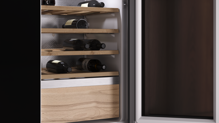 Drewniane półki z prowadnicami, które redukują drgania i utrzymują aromat dojrzałego wina. Uniwersalność chłodziarki pozwala na regulację wysokości jej półek, aby stworzyć miejsca na butelki o różnych rozmiarach.
