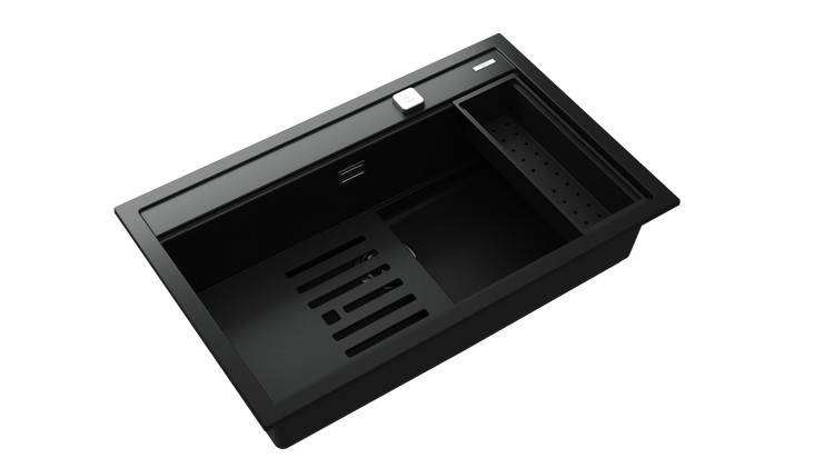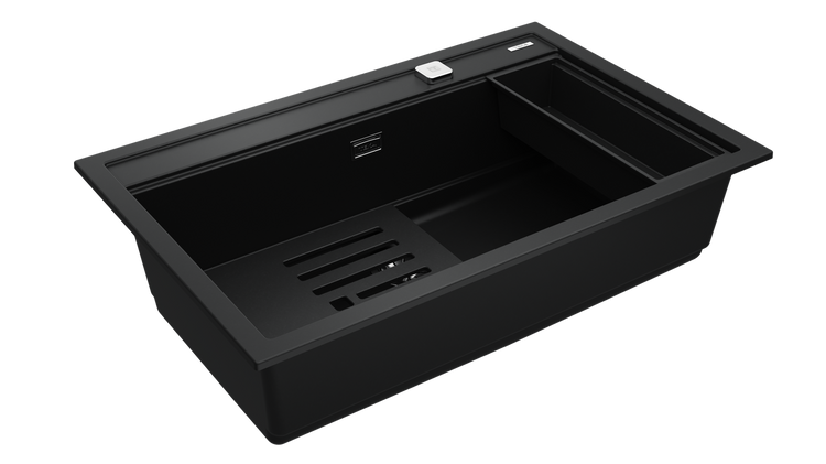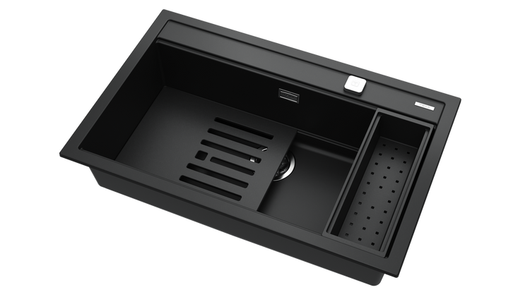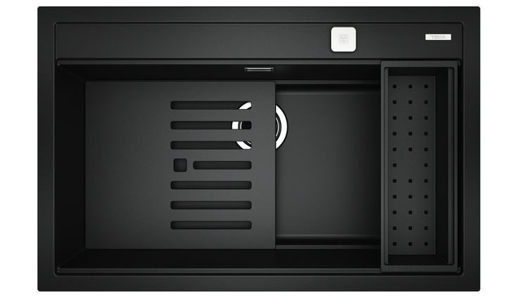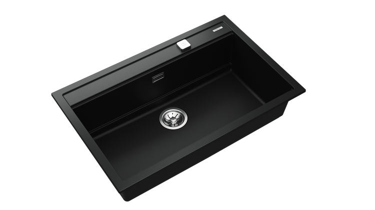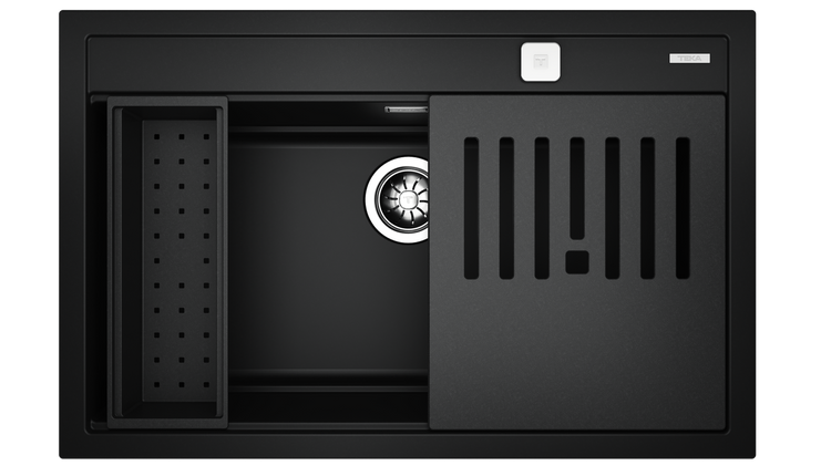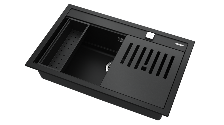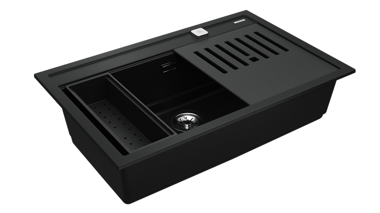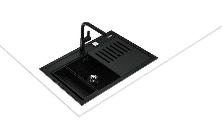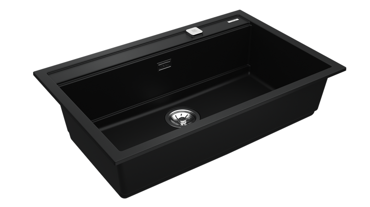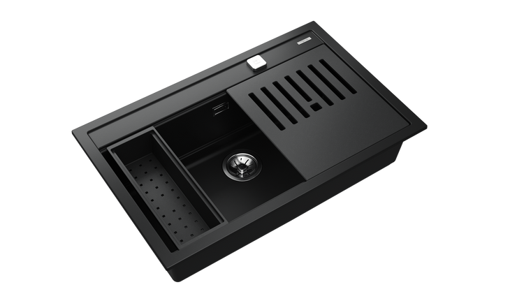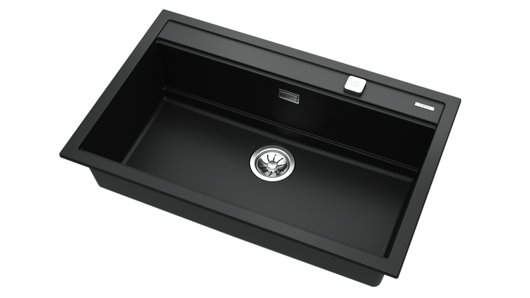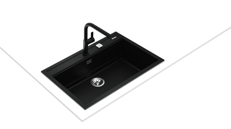 - Tegranit, kolor czarny, Odporny na promieniowanie UV, Koncepcja wielopoziomowego stanowiska pracy, Komora XXL 726 x 320 x 200 mm, Wymiary zew. 790 x 510 mm, Do szafek: 80 cm, Montaż nablatowy, W zestawie:, Komplet odpływowy z automatem zamykającym i syfon