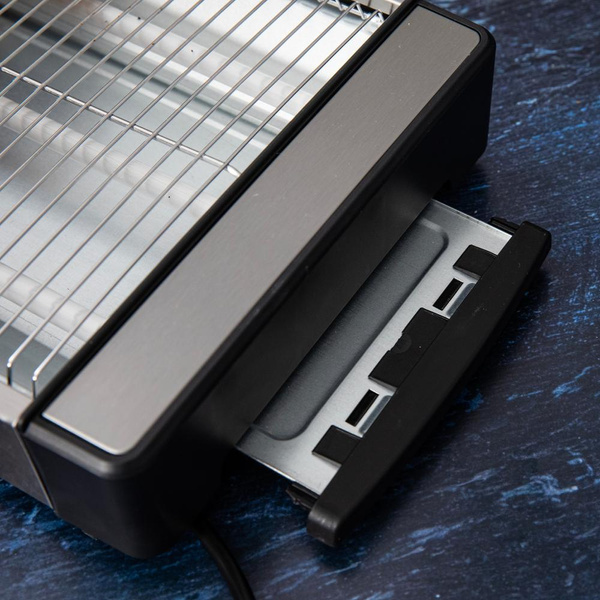 Model wyposażony jest w cyfrowy zegar oraz 6 poziomów opiekania, co pozwala dostosować stopień wypieczenia do własnych upodobań. Dzięki wyjmowanej szufladzie na okruszki czyszczenie urządzenia jest szybkie i bezproblemowe, a schowek na kabel zwiększa komfort przechowywania. Toster łączy funkcjonalność z nowoczesnym wyglądem, sprawiając, że pasuje do każdej kuchni.