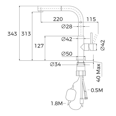 - Wyciągana wylewka z jednym trybem strumienia (normalny strumień wody) – wygodne mycie naczyń i płukanie zlewu.