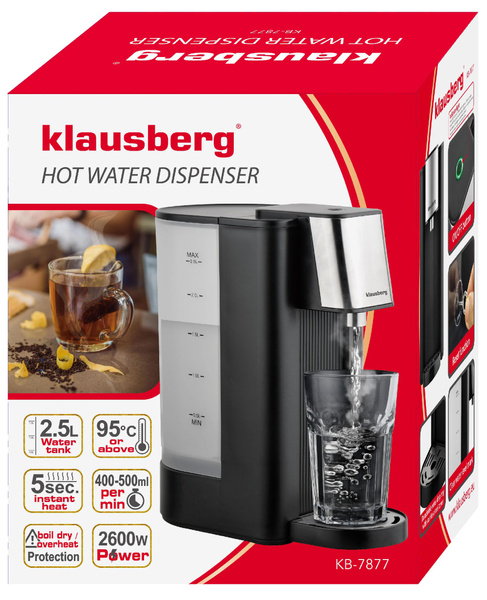 - Zyskaj komfort natychmiastowego dostępu do gorącej wody dzięki nowoczesnemu dystrybutorowi KLAUSBERG KB-7877. To doskonałe rozwiązanie dla domu, biura i gastronomii, które eliminuje konieczność używania tradycyjnego czajnika. Woda o temperaturze ponad 95°