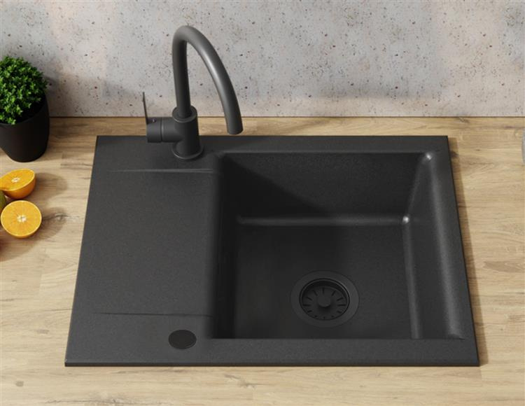 - ZLEWOZMYWAK GRANITOWY JEDNOKOMOROWY ONYX Z CZARNYM ODPŁYWEM, OCIEKACZEM ORAZ BATERIĄ