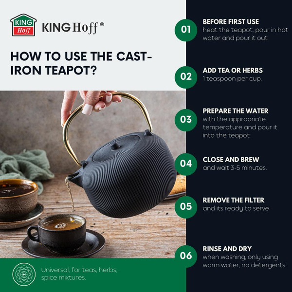 - Ten elegancki żeliwny imbryk z zaparzaczem od KINGHoff to idealne połączenie funkcjonalności, trwałości i stylowego designu. Wykonany z wysokiej jakości żeliwa z emaliowanym wnętrzem, przez długi czas utrzymuje temperaturę naparu. Dzięki wygodnemu uchwyto