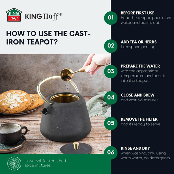 - Odkryj żeliwny imbryk KINGHoff, który łączy minimalistyczny design z wysoką funkcjonalnością. Dzięki starannie wyprofilowanemu dziobkowi, złotemu uchwytowi i emaliowanemu wnętrzu, ten zaparzacz do herbaty stanowi elegancki i trwały element każdej kuchni.
