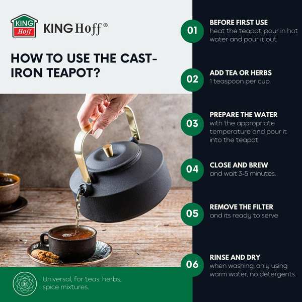 - Żeliwny zaparzacz KINGHoff KH‑1935 łączy surową, matową czerń z wyrazistymi, złotymi akcentami, nadając codziennemu parzeniu herbaty elegancką oprawę. Masę żeliwa docenisz za długie utrzymywanie temperatury, a emaliowane wnętrze – za łatwe czyszczenie i