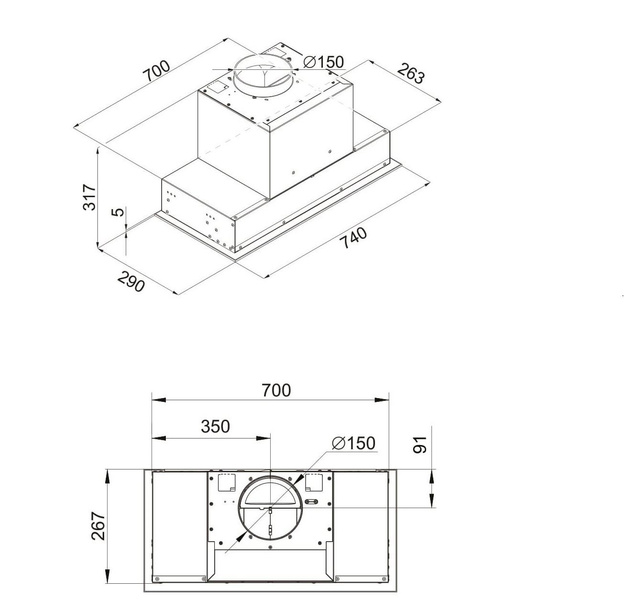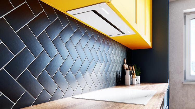 - Schowany w szafce, okap jest wyjątkowo cichy (46 dB na najniższym biegu), zapewniając komfort użytkowania w kuchni.