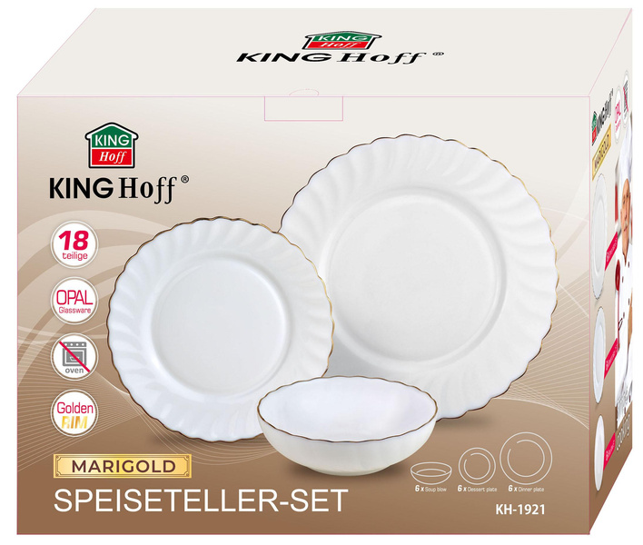 Zestaw talerzy, 18 el., opal, biały ze złotym zdobieniem, seria MARIGOLD, KINGHoff, KH-1921 KH-1921
